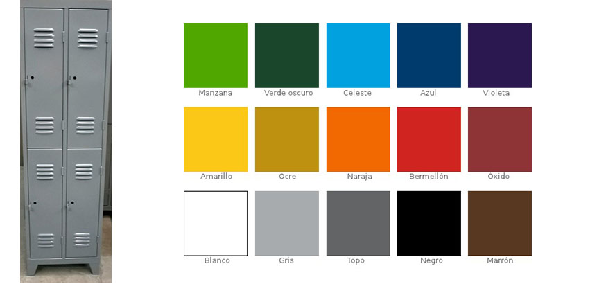 Estructura exterior en chapa Nº 22 - Puertas Nº 20 - Patas sanitarias Nº 18. Puertas reforzadas. Pintura horneable a 180º de temperatura. 52,5 cm (Frente) - 1,85 m (Alto) - 52 cm (Fondo) Medidas de cada puerta: 22 cm (Ancho) x 81 cm (Alto)